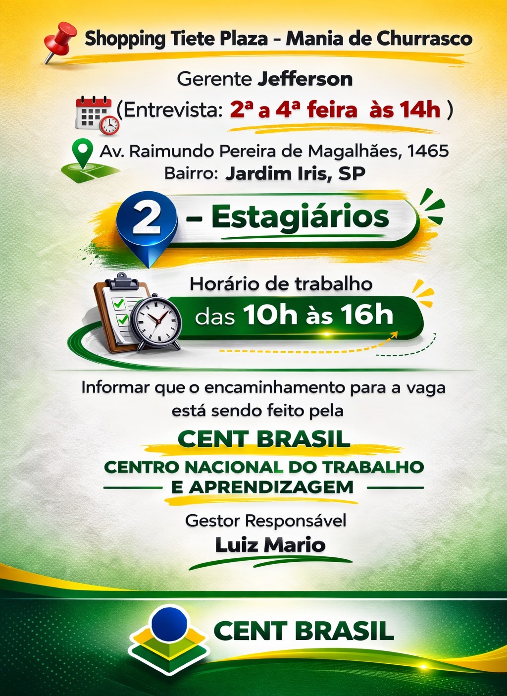 VAGAS–ESTAGIÁRIO(A)📍 São Paulo – Capital📲 Para agendar sua entrevista, acesse o Grupo Oficial de Vagas pelo link abaixo:https://chat.whatsapp.com/L72CiG9nKeT5juAYLO6lWo?mode=gi_tVocê é estudante e quer iniciar sua trajetória profissional? Estamos com processo seletivo aberto para Estagiários(as) com início imediato em SP.Requisitos:* Ter 16 anos ou mais* Ser Estudantes* Residir em São Paulo–CapitalBenefícios p/ o contratado(a):* Bolsa Estágio / V.T / Carteirinha do Estudante* Carteirinha do SESC Lazer (benefício extensivo à família)* Plano Odonto e Saúde (opcional)