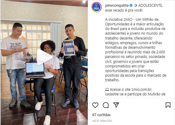 A Prefeitura Municipal de Vitória da Conquista realiza postagem em suas redes sociais para divulgar o Mutirão de Oportunidades.